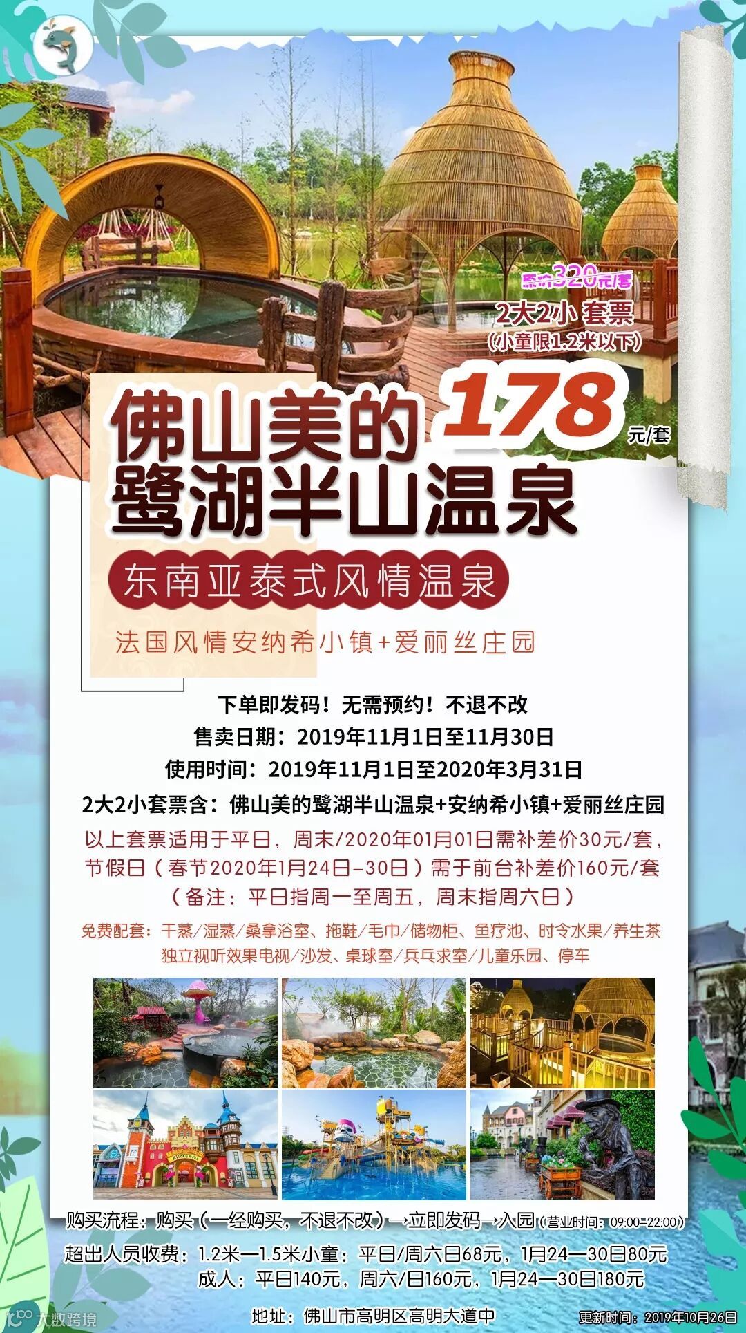 (2) 套票适用于周一至周五,周六日或2020年01月01日需补差价30元/套,节假日(春节2020年1月24日-30日)需在前台补差价120元/套;