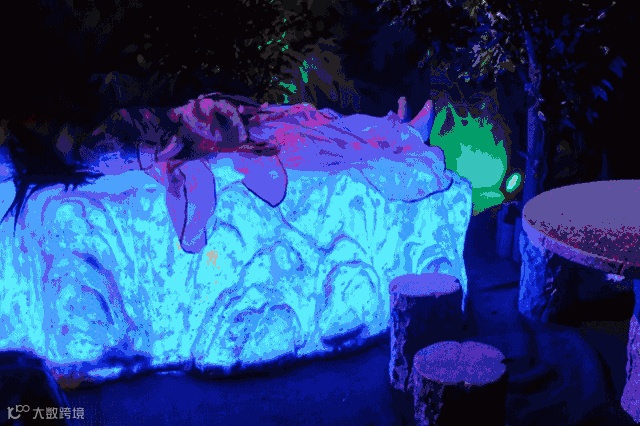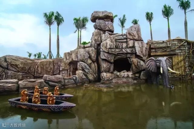 一进大门口,正前方便是我们探险之旅的第一个目的地“贝丘山洞”。一汪清潭跃然眼前,各种原始动物在潭中嬉戏,古老的山洞墙壁上刻画着各种新石器时代标记……