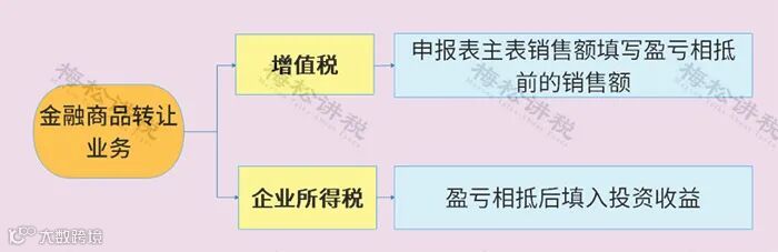 增值税纳税申报时,按照扣除之前的不含税销售额填入纳税申报表主表销售额相关栏次。而金融资产转让的会计处理和企业所得税申报则是通过投资收益体现在当期损益及应纳税所得额中。两相对比,增值税申报收入要大于企业所得税收入。