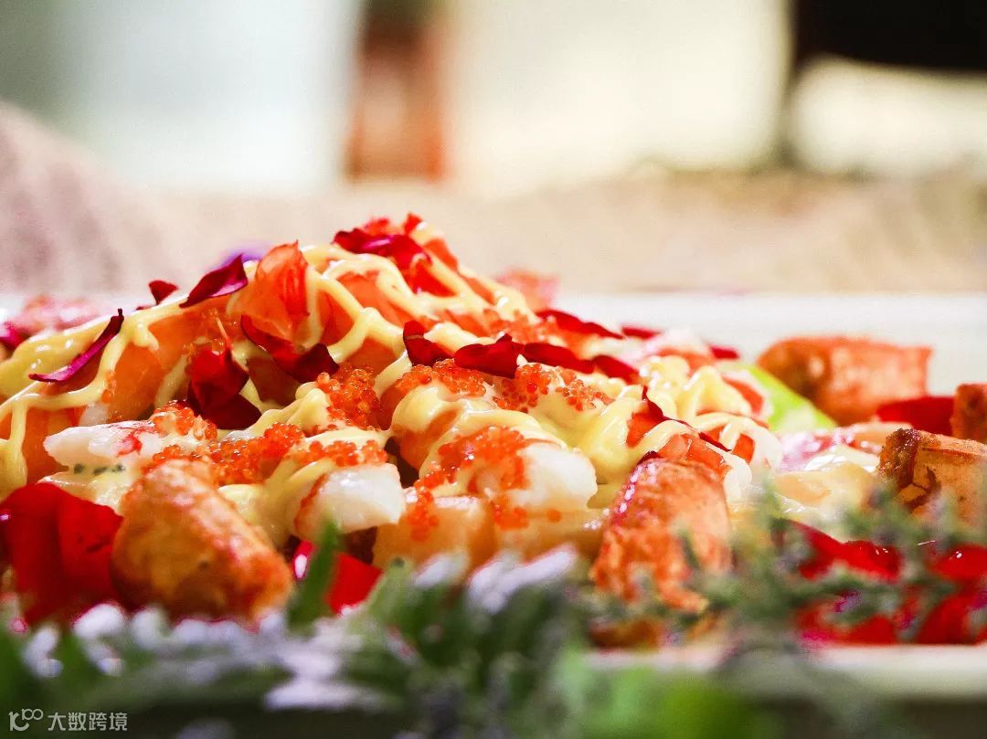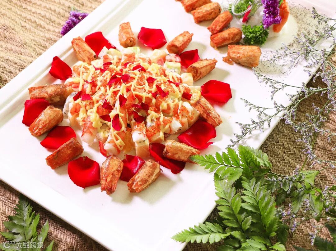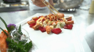 新鲜的九节虾烫熟后去壳取肉,搭配清润的水果沙拉,非常适合食客们在干燥的秋季食用。
