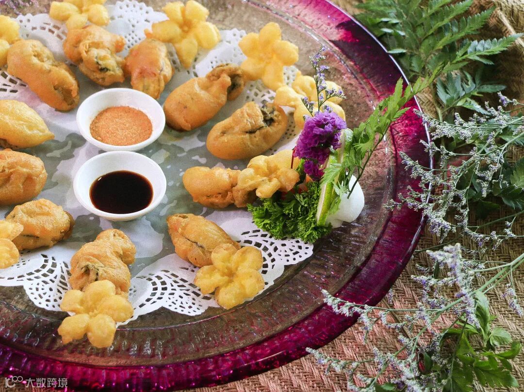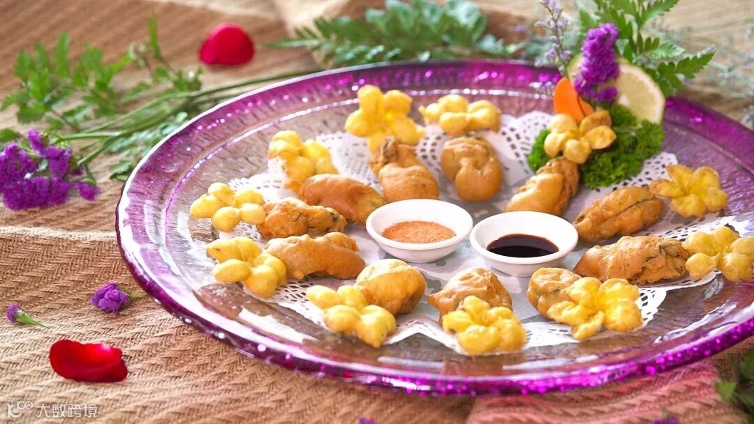 鸡蛋花,因它清香的味道与百搭的属性,几乎成为了陈村花宴标配。鸡蛋花拼鲜蚝仔,油炸后的鸡蛋花片片香脆,而鲜蚝仔外酥内嫩,一口脆一口软 ,一定能让你胃口大开。