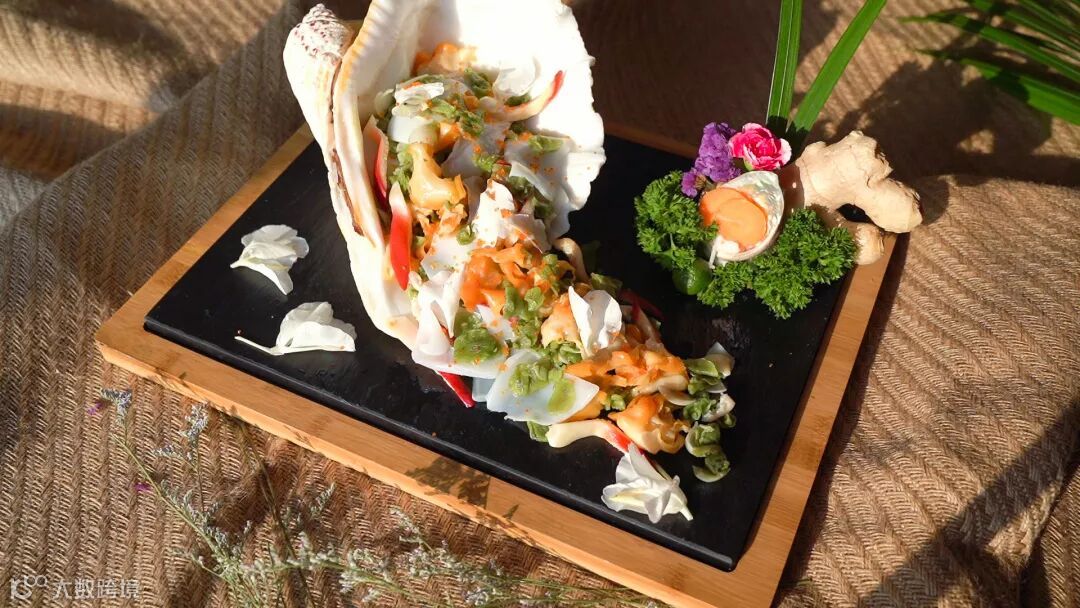 把海螺片、胭脂蚌、响菜、姜花充分拌匀,盛入洁白的大贝壳内,一道精致的凉菜就此完成~