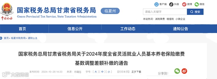 近期,国家税务总局甘肃省税务局发布《关于2024年度全省灵活就业人员基本养老保险缴费基数调整差额补缴的通告》。