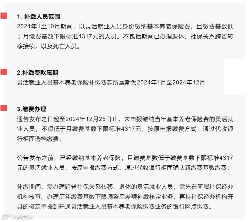 2024年度全省灵活就业人员基本养老保险缴费基数调整差额补缴工作集中办理,截止时间为2024年12月25日,逾期不再办理。