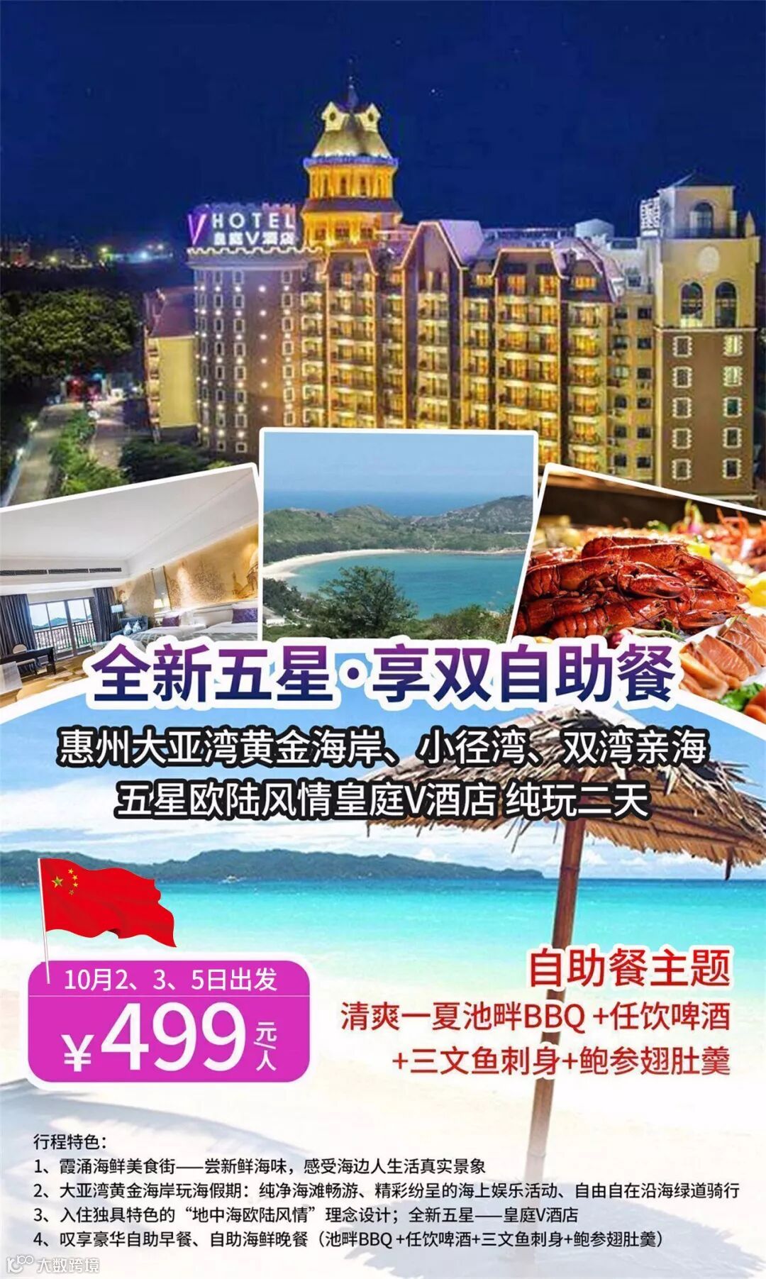 惠州大亚湾黄金海岸、小径湾、双湾亲海、五星欧陆风情皇庭V酒店 纯玩二天