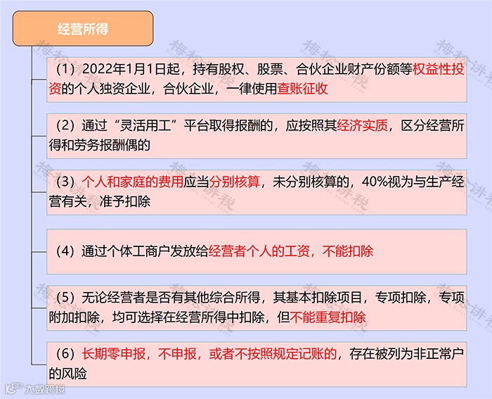经营所得涉及的主体包括个体工商户、个人独资企业和合伙企业。近年来,大肆利用经营所得核定征收税筹翻车的事件频发,因此其风险主要在于业务的真实性上,主要有以下6点值得关注: