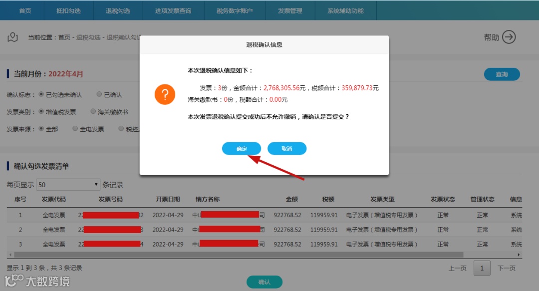 (3)申请统计完成后,需要对统计表进行确认,才能进行当期申报抵扣工作,点击“确认”后,平台会弹出提示信息,“是否确认,确认后当前统计表将作为申报的依据”,点击提示对话框中的“确定”按钮。