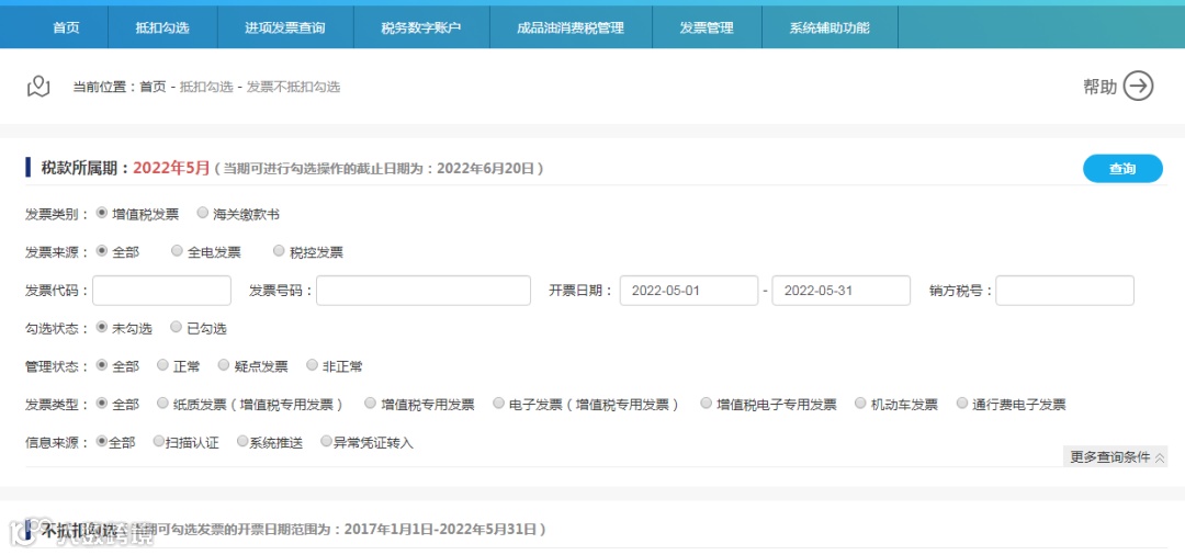 本功能主要提供按照税款所属期查询和逐票勾选(支持同时勾选多份发票)的操作方式,实现纳税人选择相应申报期内用于申报不抵扣的增值税进项发票清单信息(包括增值税专用发票、机动车销售统一发票、通行费发票和具有抵扣功能的全电发票)和海关缴款书的功能。