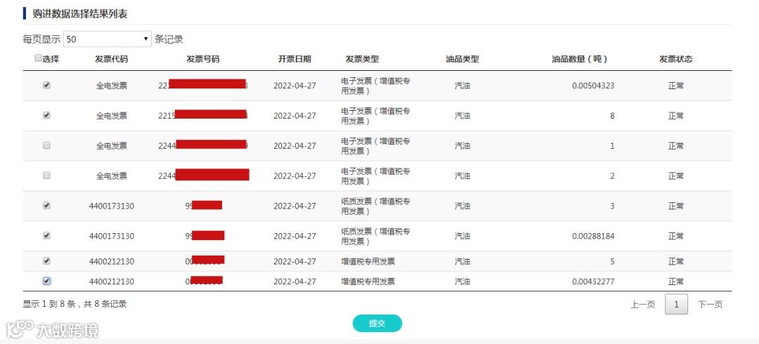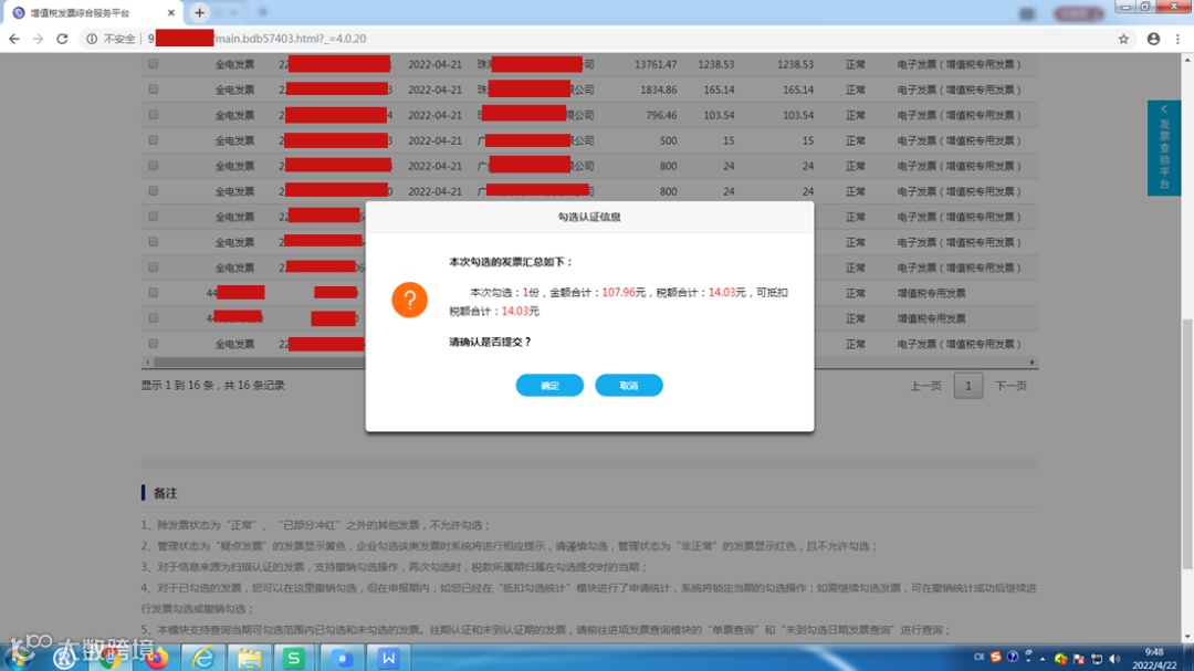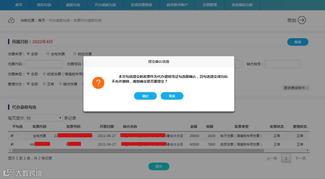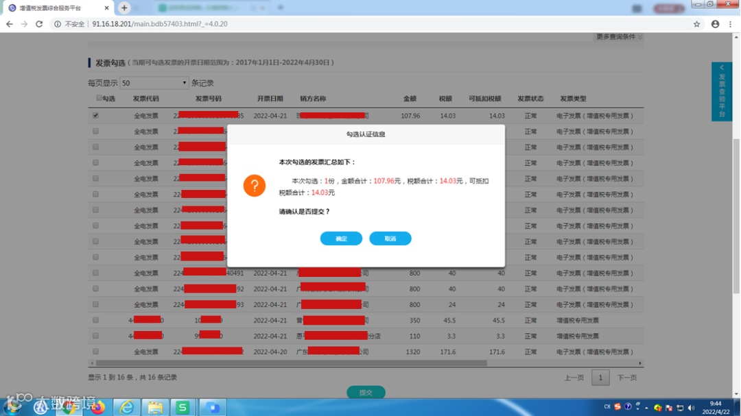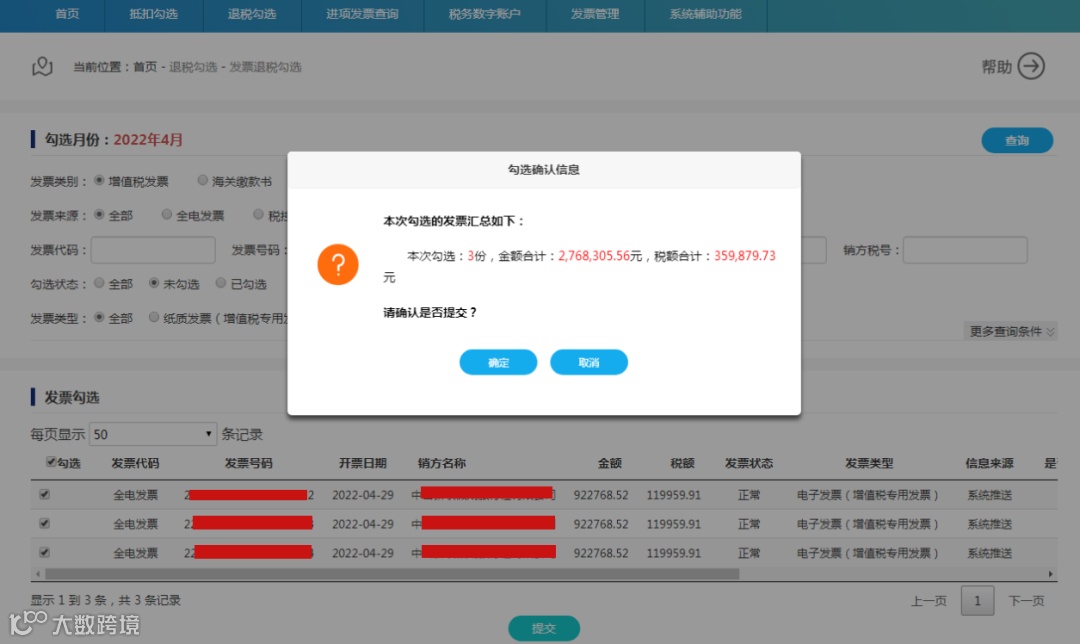 第二步:确认本次需要勾选的发票全部勾选完成后,点击“提交”,弹出勾选认证信息对话框如下: