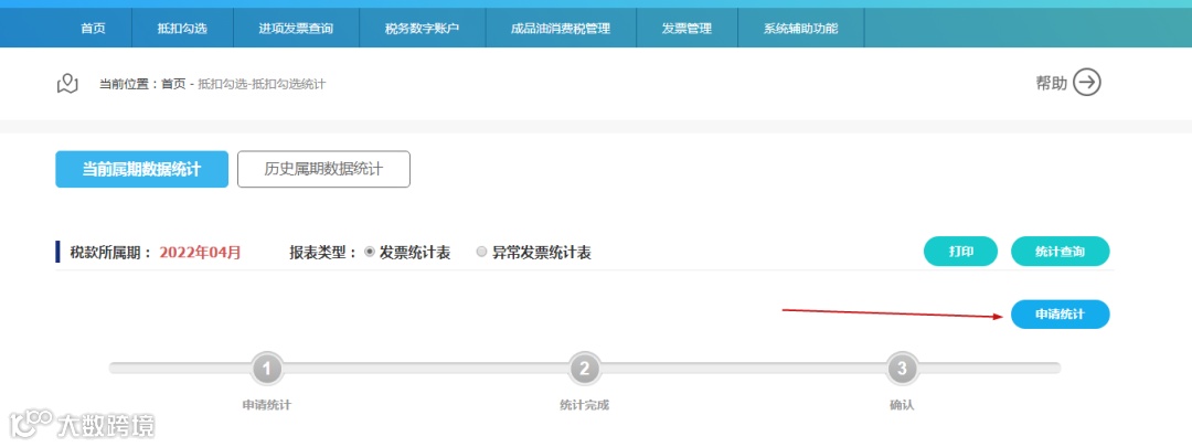 (1)申请统计:如果当前税款所属期还未生成统计表,纳税人可以点击“申请统计”进行统计。