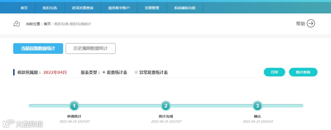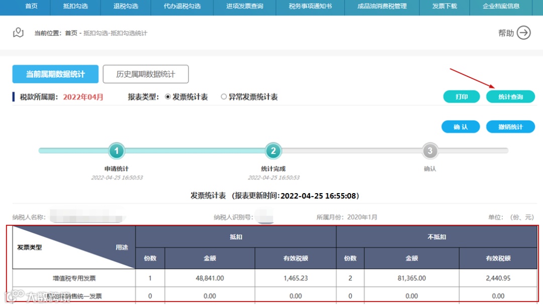 申请统计提交后,平台会进行实时统计,在申报期内点击“申请统计”后,平台将锁定当期抵扣勾选操作,如需继续勾选,可点击“撤销统计”按钮,撤销成功后系统将自动解锁当期抵扣勾选操作。