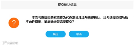 (2)纳税人根据查询结果选择发票进行不抵扣勾选操作,对于本次需要勾选的发票对应的不抵扣原因,确认本次需要勾选的发票全部勾选完成后,可以点击“提交”按钮,弹出勾选认证信息对话框如下: