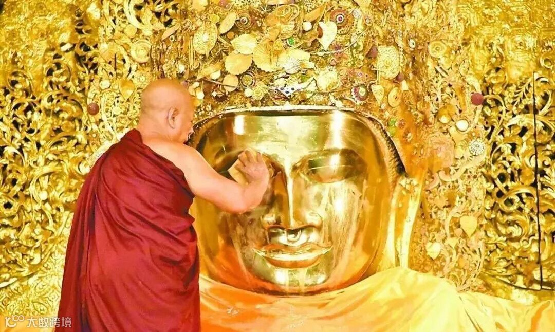 虔诚地为金色大佛擦洗脸颊