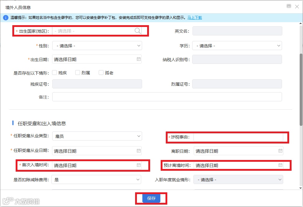 (2)根据实际情况录入新入职员工详细信息。相较于境内人员,境外人员必填信息还包括国籍(地区)、出生国家(地区)、涉税事由、首次入境时间及预计离境时间。录入完成后点击【保存】,完成人员添加。