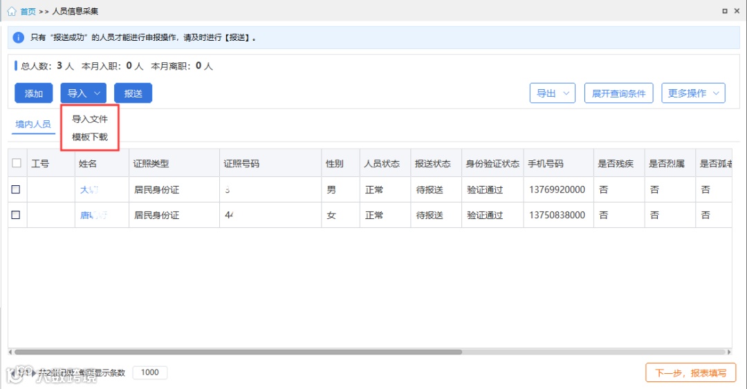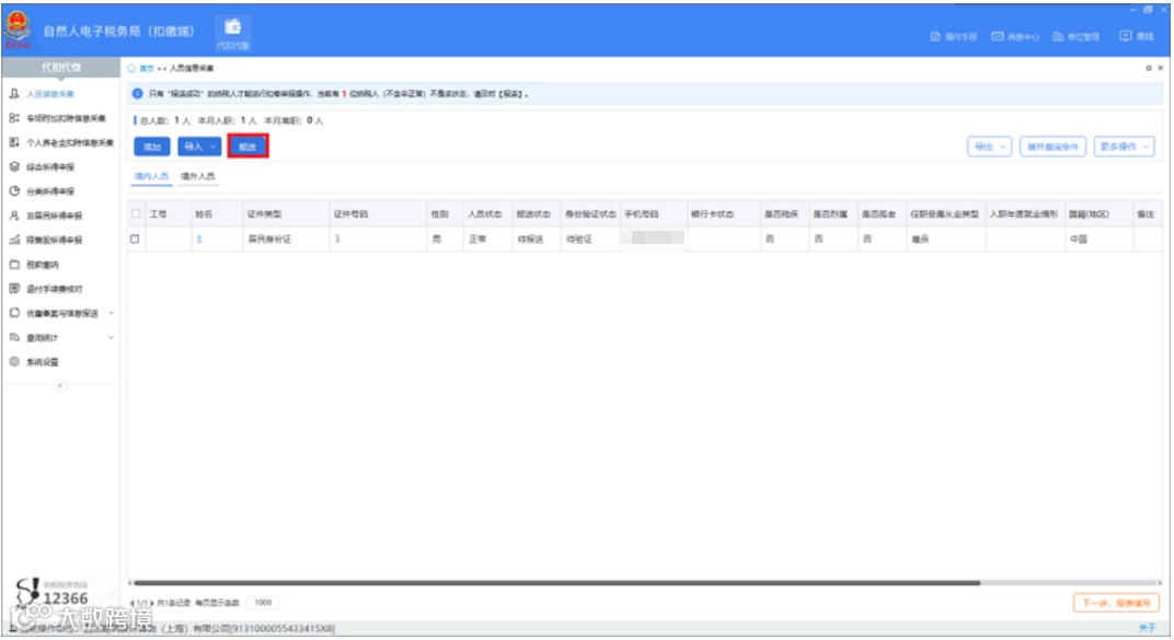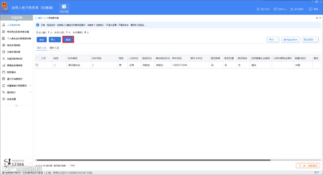 人员信息录入完成后,点击左上方【报送】按钮,将录入人员信息发送税务端进行验证。只有报送状态为【报送成功】的人员才允许进行申报表报送等业务操作。