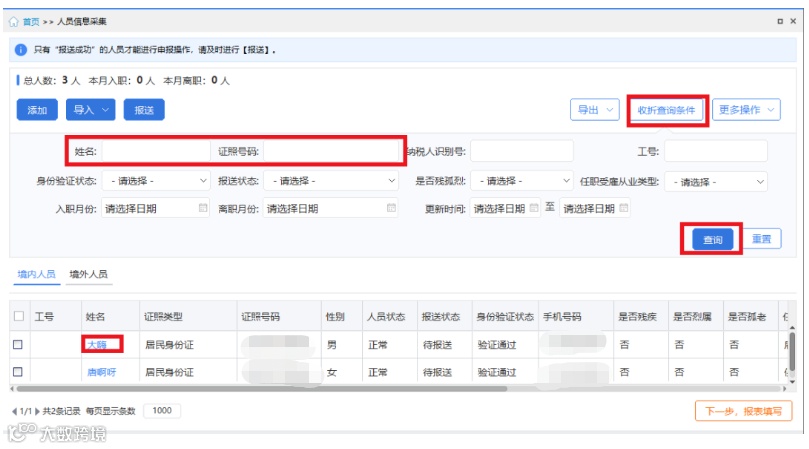 (二)点击【首页】-【人员信息采集】-【展开查询条件】来展开具体的查询条件,输入姓名或证件号码快速定位离职员工,点击【查询】。