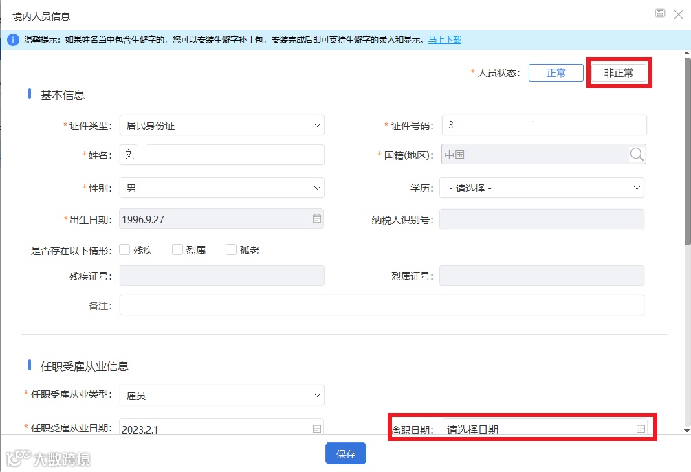 (四)将人员状态修改为【非正常】,同时录入离职日期,录入完毕后点击【保存】。