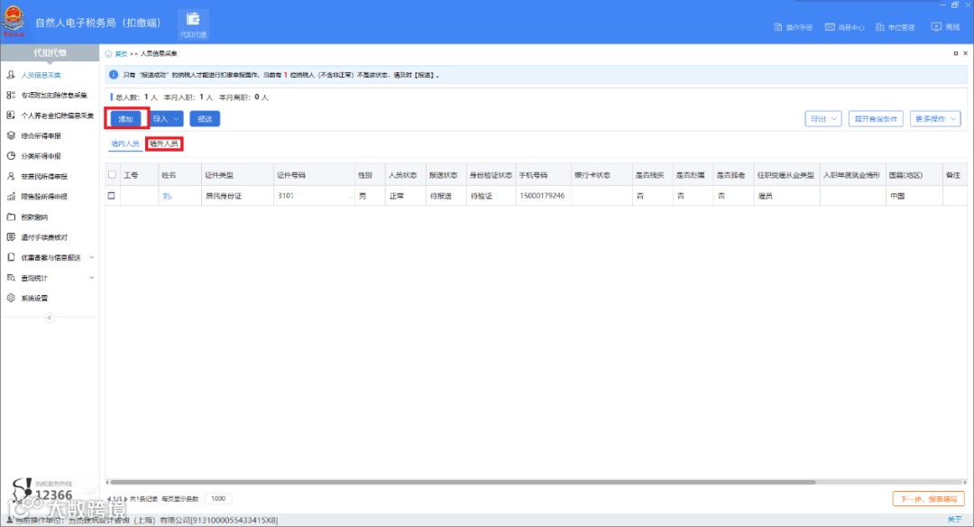 (1)选择【境外人员】,点击【添加】,进入境内人员信息填写页面。