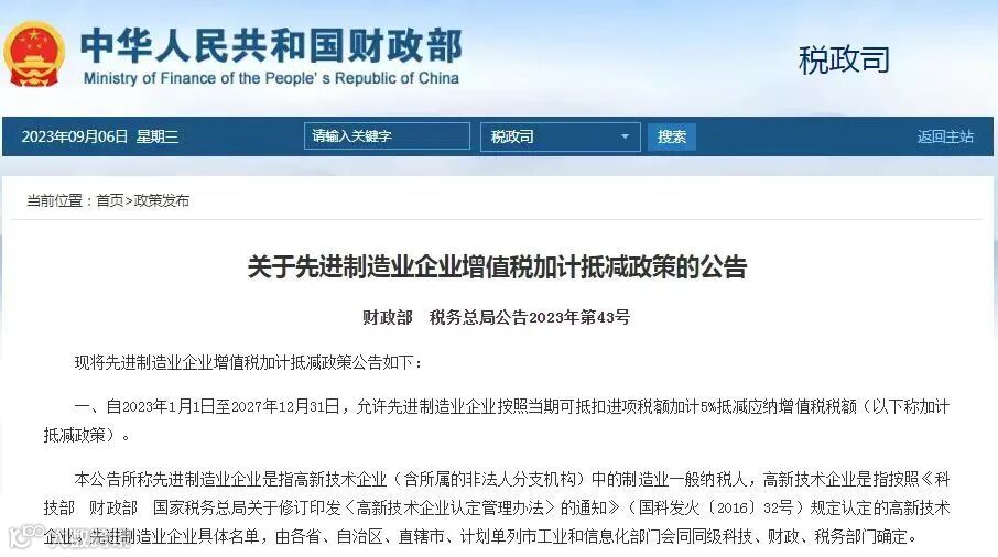 好消息!自2023年1月1日至2027年12月31日,允许先进制造业企业按照当期可抵扣进项税额加计5%抵减应纳增值税税额 。