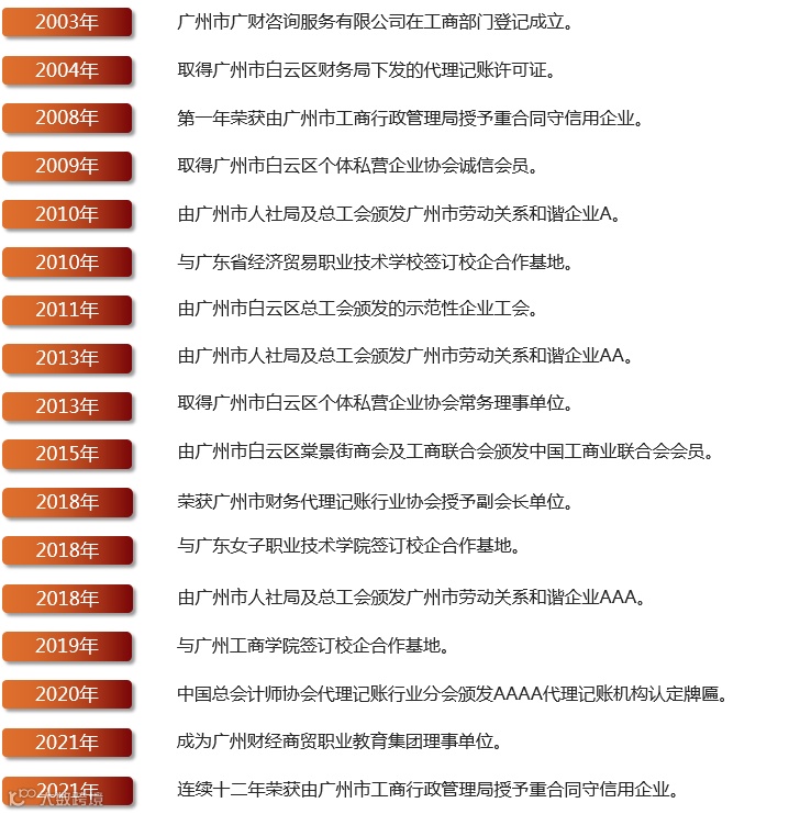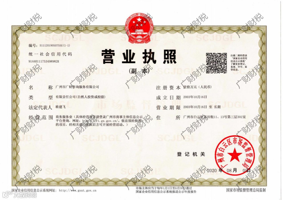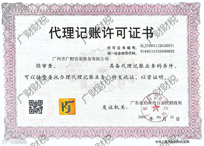 广州市广财咨询服务有限公司成立于2003年10月16日,是经广州市财政局批准,在广州市工商行政管理局登记注册,取得代理记账许可证书的专业工商税务咨询服务企业。