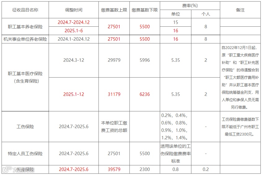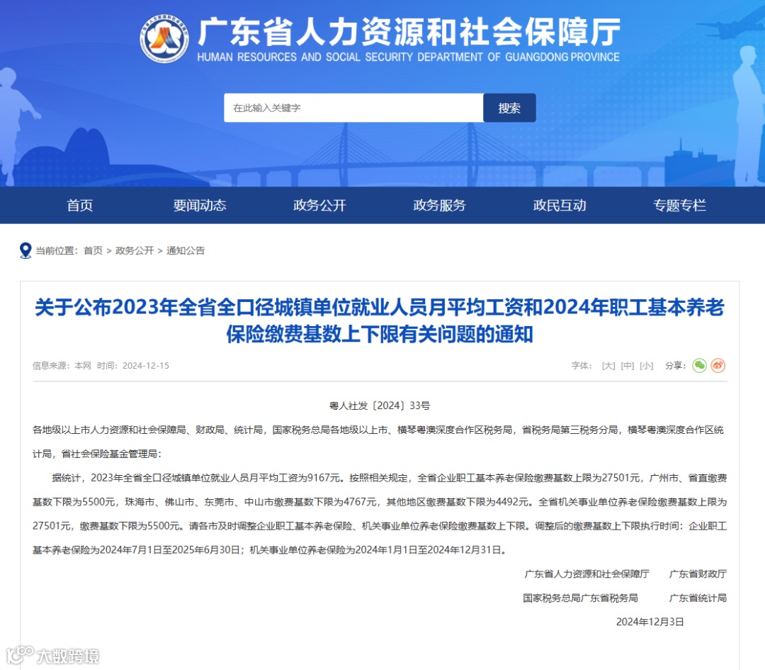 全省企业职工基本养老保险缴费基数上限为27501元,广州市、省直缴费基数下限为5500元,珠海市、佛山市、东莞市、中山市缴费基数下限为4767元,其他地区缴费基数下限为4492元。