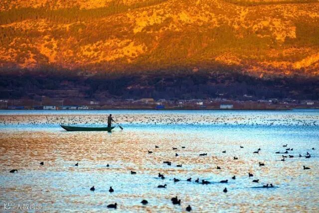 黎明,拉市海渐渐苏醒;东方破晓,暖暖的色彩如金叶般铺在拉市海的波光里,即刻间,天空和大地被橘红渲染,成为一幅古典的油画模样。