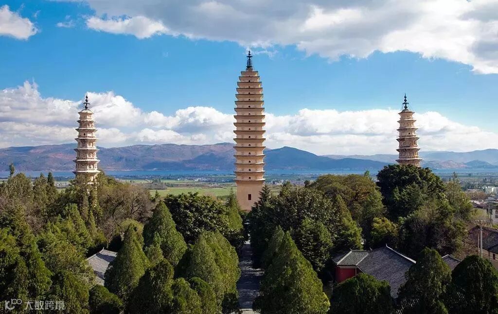 三塔由一大二小三阁组成。大塔又名千寻塔,当地群众称它为“文笔塔”,通高69.13米,底方9.9米,凡16级,为大理地区典型的密檐式空心四方形砖塔。