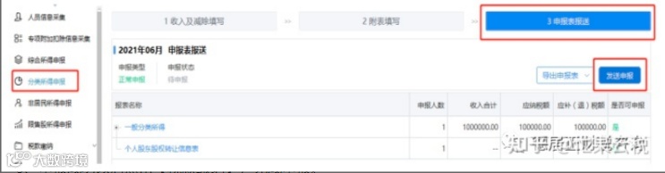 4)点击【分类所得申报】--【申报表报送】--【发送申报】