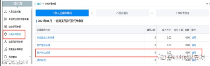 1)点击【分类所得申报】--【财产转让所得】--【填写】--【添加】
