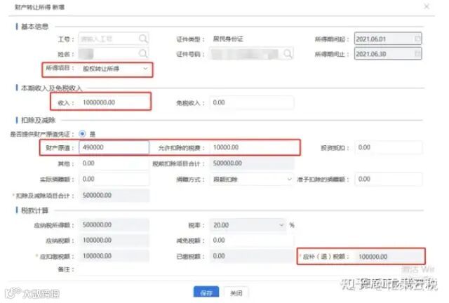 3)点击【所得项目】选择【股权转让所得】,并在相关收入、扣除类空格处填上企业数据,系统自动计算出【应退补税额】,点击【保存】。