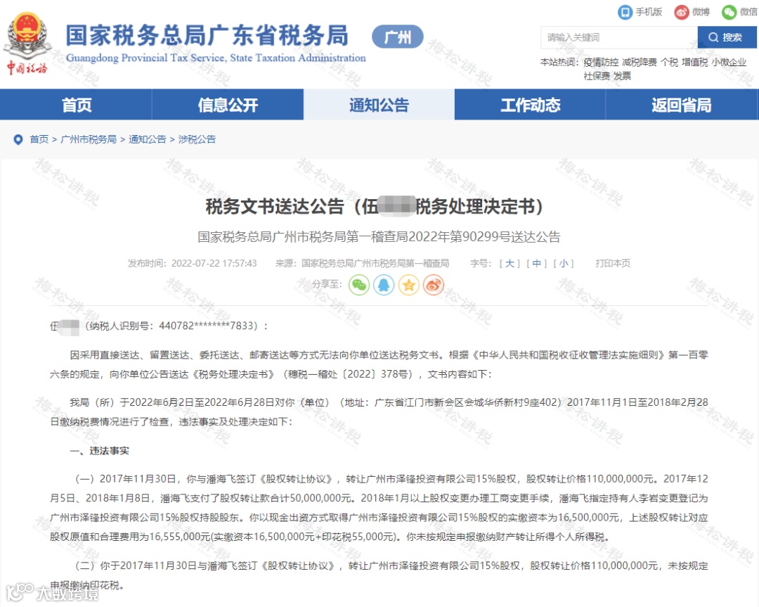 1、2017年11月30日,伍某与潘某签订《股权转让协议》,转让广州市泽锋投资有限公司15%股权,股权转让价格110,000,000元。2017年12月5日、2018年1月8日,潘某共支付伍某股权转让价款50,000,000元。2018年1月股权变更办理完成,伍某未按规定申报缴纳财产转让所得个人所得税。