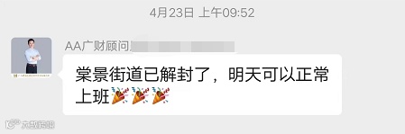 4月25日广州白云区棠景街36号网格迎来了解封,结束了历时两个多星期的居家办公模式,广财公司正式恢复线下办公。