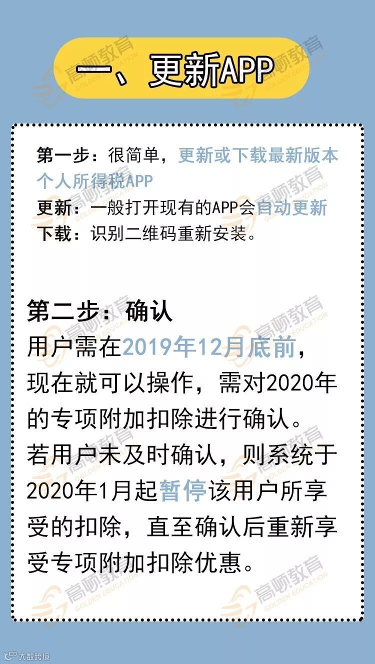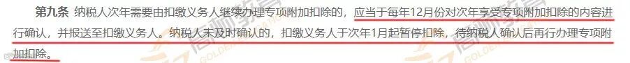 根据《国家税务总局关于发布<个人所得税专项附加扣除操作办法(试行)>的公告》(国家税务总局公告2018年第60号)第九条规定,纳税人次年需要由扣缴义务人继续办理专项附加扣除的,应当于每年12月份对次年享受专项附加扣除的内容进行确认,并报送至扣缴义务人。纳税人未及时确认的,扣缴义务人于次年1月起暂停扣除,待纳税人确认后再行办理专项附加扣除。