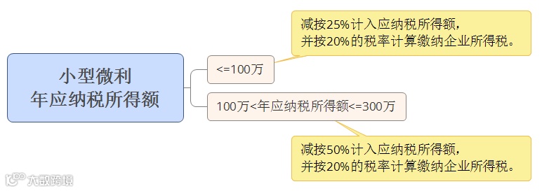 举例说明,2020年一个年应纳税所得额为300万元的企业,如果满足其他的条件,那么企业所得税=100*25%*20%+200*50%*20%=25万元。