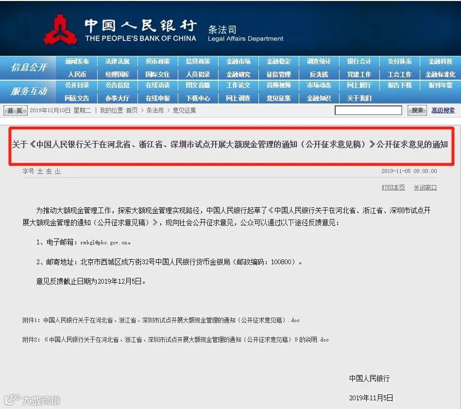 近日,中国人民银行发布《关于<中国人民银行关于在河北省、浙江省、深圳市试点开展大额现金管理的通知(公开征求意见稿)>公开征求意见的通知》。