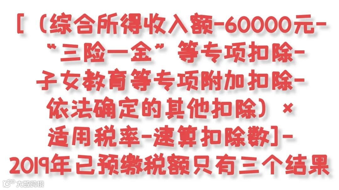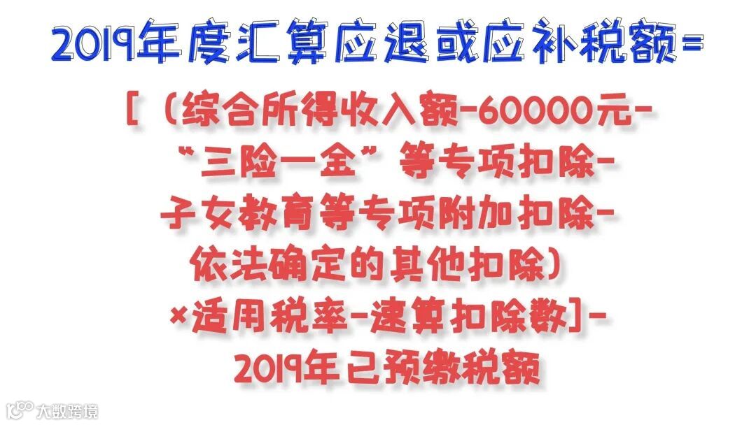 上面就是汇算的公式,这个公式前面就是综合所得的计税公式,口径当然是按年来的,按年算出应交个税后减去平时扣缴义务人已经扣缴的就是应退或者应补的税额。