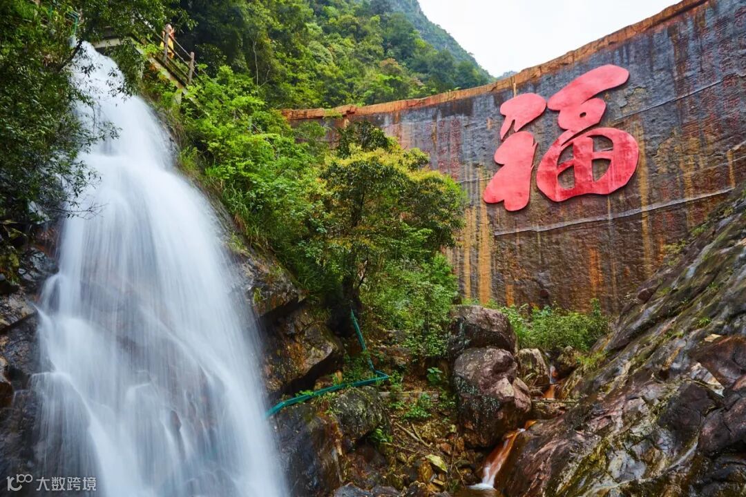 崖面上巨大的福字和飞泻的瀑布
