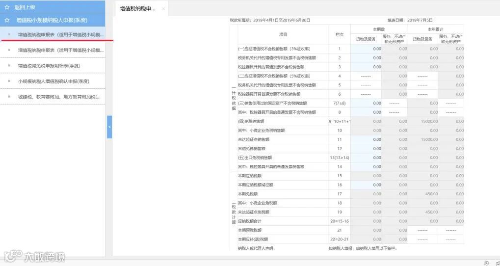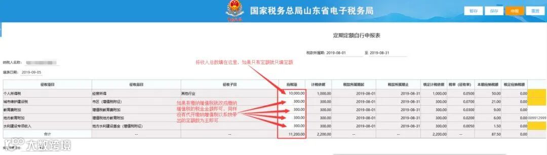 ②代开了普通发票或只领了定额发票,就将代开的发票价税合计总额(票面总价÷1.03=应填金额)或领取的定额发票总额填写至11栏未达起征点栏次,以截图单位为例,月核定额5000所以季度定额为15000(5000*3个月),将15000填至11栏即可保存申报。