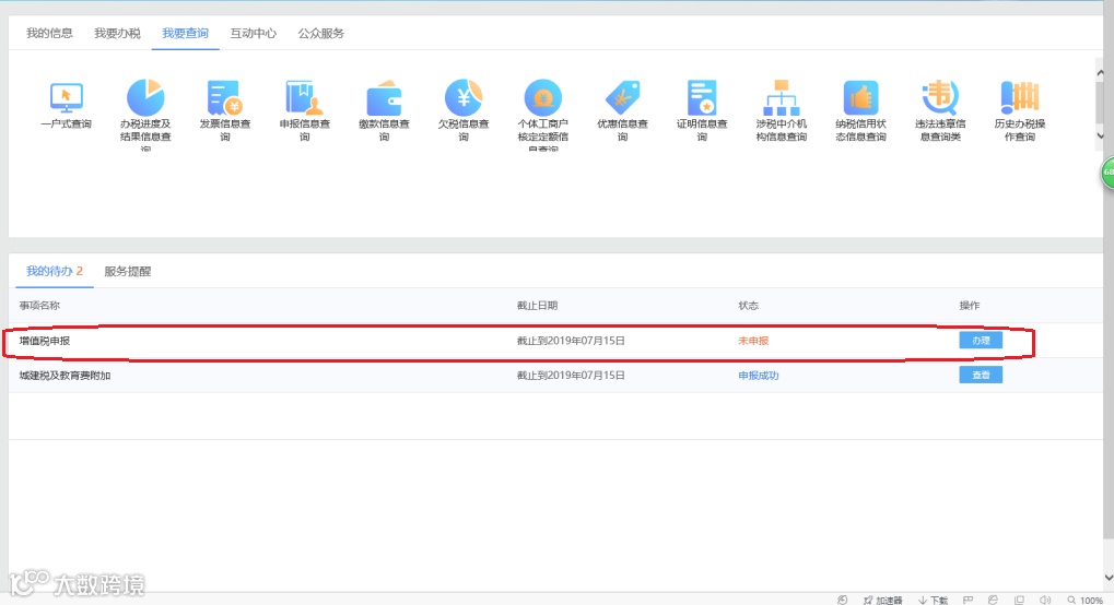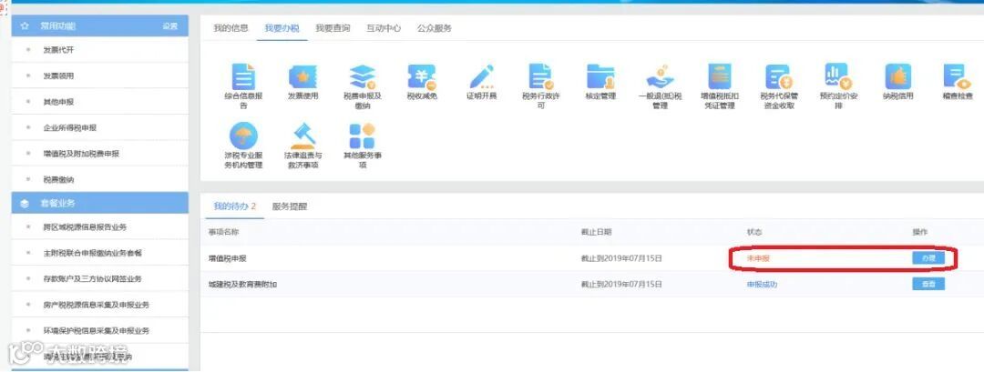 点击左边菜单首栏返回上级字样返回前一页开始进行本期申报,注意看下方我的待办提示,根据下方事项名称选择未申报事项点击办理进行申报。