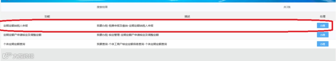 搜索后页面如下,点击定期定额纳税人申报后的办理按钮进入申报。