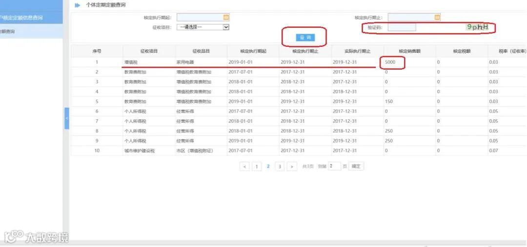 以下图为例输入好验证码后点击查询已查询出本单位所有定期定额信息,注意找到在有效期内的增值税月核定金额信息以备后面填写申报表。(下图所示可以看到实例单位定额核定是月定额5000,按季申报时销售收入就是15000未达起征点收入)
