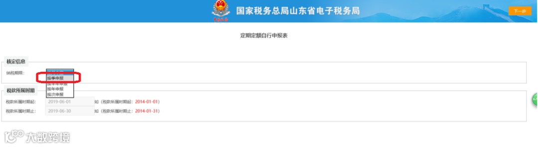 6、点击后页面如图,将纳税期限点击按月申报后的下拉箭头改成按季申报,再点击页面右上角下一步继续申报。