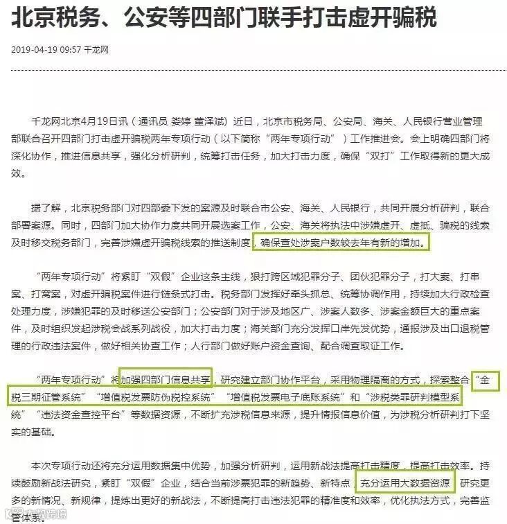 会上明确四部门将深化协作,推进信息共享,强化分析研判,统筹打击任务,加大打击力度,2019年打击骗税虚开呈高压态势。财务和老板注意了!!!