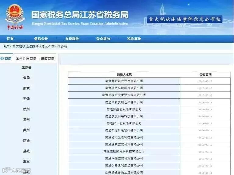 2019年3月15日,国家税务总局江苏省税务局一次性公布了256家重大税收违法的企业,全因虚开发票被移送司法机关处理!