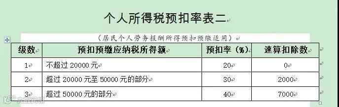 应纳税所得额:劳务报酬所得以每次收入额为预扣预缴应纳税所得额,计算应预扣预缴税额。劳务报酬所得适用个人所得税预扣率表二。