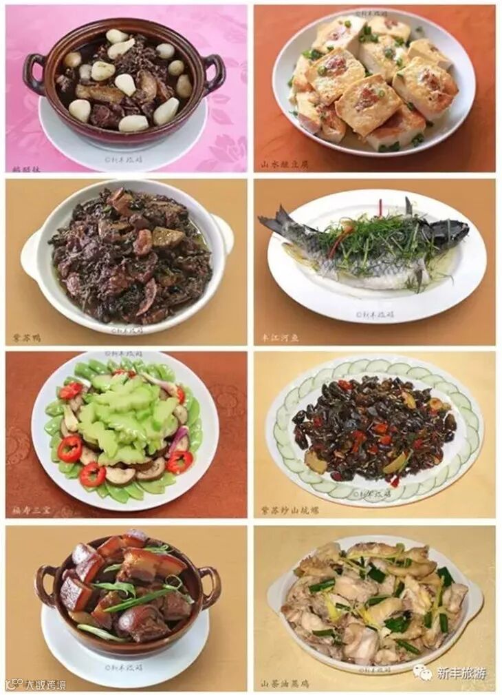 “古法焖大肉”,“山水酿豆腐”,“鹅醋砵”,“紫苏鸭”,“丰江河鱼”,“福寿三宝”,“山茶油蒸鸡”,“紫苏炒山坑螺”这8道最具代表性的“新丰特色菜”。