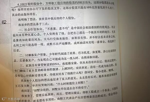 您不愧为改革开放后罕见的放弃个人股权的企业家,您放弃了个人应得的股份。您说原因之一是社会价值倾向,“不患寡而患不均”的传统观念和仇富心态,使您在名利之间不要利。二是您讨嫌暴发户形象。三是家族没有掌管财富的DNA。您放弃了,王太也同意了,管理层都放弃了。这是一个了不起的时刻,比起那些巧立名目吞食国有资产的“改制者”高尚无数倍(他们永远没有资格把您当职业经理人来评价)。但是,很客观地说,与那些完全是依靠自己奋斗、只是不得不带个“红帽子”的创业企业相比,万科先天就是国企,按照当时政府的股改规定,您为首的创业者能够量化到自己头上的股份比例非常有限(当然你们放弃的股权价值累积至今也是天价了,这就是我为什么主张万科董事会要长期性地从报酬上善待您的原因)。