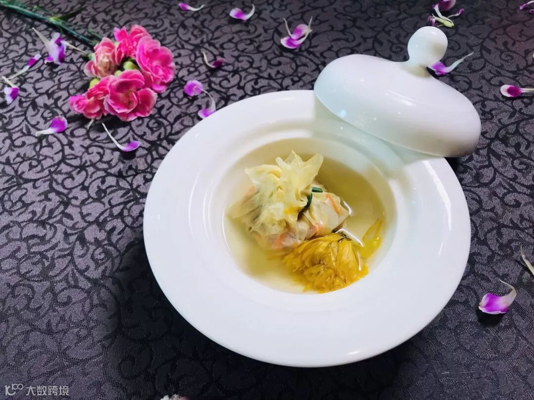 成熟的金丝菊花瓣在汤汁中随性张扬,姿态各异。豆皮包着金针菇、木耳、胡萝卜等爽口的食材,吸饱汤汁,一口咬下去,鲜美的汤汁首先充盈口腔,接着便是各种爽口食材带来的咀嚼的快感。全素食材的搭配,清新解腻又健康。