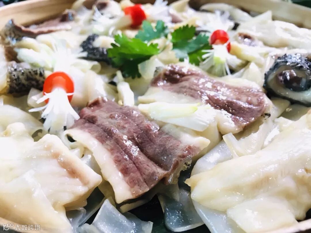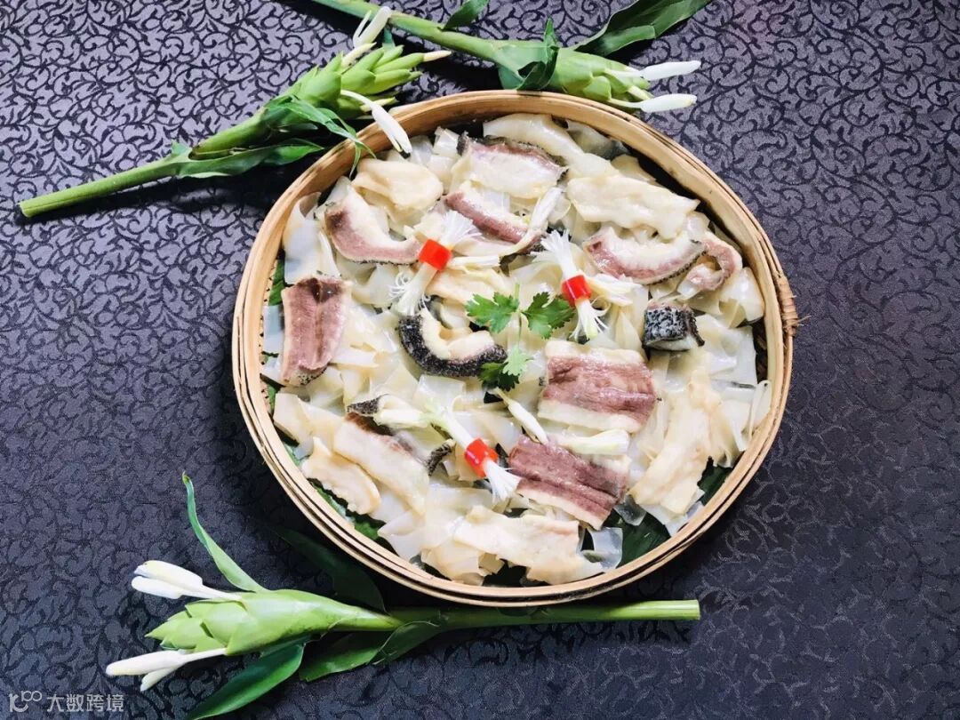 精选在水库无污染环境里生长的大鱼,鱼身不带一丝泥味,鱼肉本身的鲜甜能够在最大程度上得到释放。大厨凭借多年对火候的控制的经验,鱼肉不生不老,熟的程度刚刚好,口感停留在最嫩滑的程度。鱼肉在高温蒸煮的环境中吸收了姜花被高温逼出的清香;鱼肉下面垫着的晶莹剔透的陈村粉也吸收了所有的肉汁和花香,每一根粉都饱含“精华”。