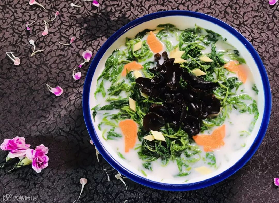 吃过了大鱼大肉,最适合吃个青菜来解解腻了。经过精心熬煮的鱼汤如牛奶般雪白,闻起来鲜香,喝起来鲜甜,用来煮桑叶,既保留了桑叶的独特的口感,又让桑叶充分吸收了鲜美的鱼汤,别有一番滋味。